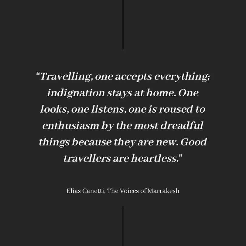 What makes this book stand out is Canetti’s power of observation. Unlike tourists who see only what they expect, he notices things others miss. The way a blind man tilts his head. The bargaining dance between merchants. The different qualities of silence throughout the city. This sharp attention turns The Voices of Marrakesh into something approaching art.